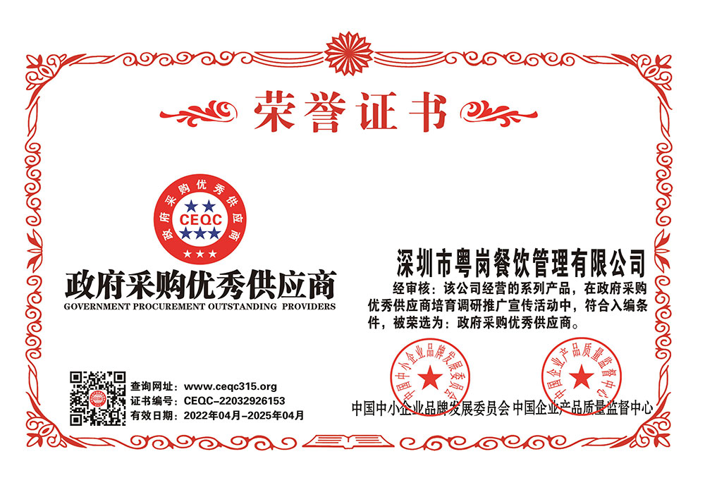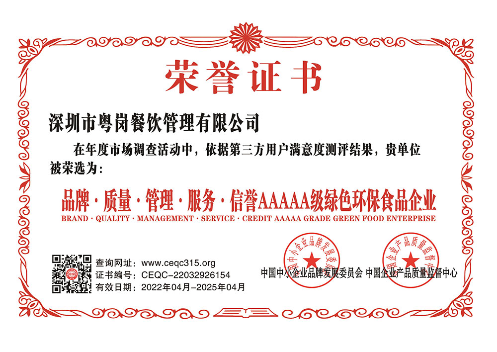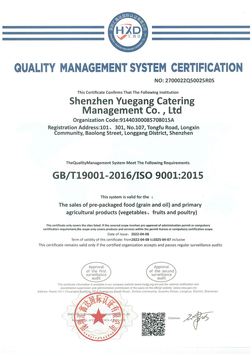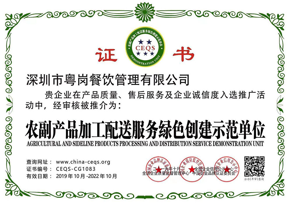 深圳市粵崗餐飲管理有限公司,是一家集蔬菜種植和農(nóng)副產(chǎn)品配送為一體的專業(yè)型餐飲公司,主要為學校、工廠企事業(yè)機關(guān)單位提供蔬菜和農(nóng)副產(chǎn)品配送服務(wù)。公司自成立以來始終以質(zhì)優(yōu)價廉、服務(wù)至上為原則,嚴格按照ISO:9001國際標準體系進行管理。同時建立了行業(yè)領(lǐng)先的配送中心、大型冷庫和保鮮庫、檢測中心以及專業(yè)化的配送團隊,能長期安全、穩(wěn)定、準時的配送貨物。我們所有蔬菜均經(jīng)過初步加工、無黃葉,無泥沙等雜質(zhì),利用率達97%以上...保障向用戶提供的各類食材的衛(wèi)生和質(zhì)量。公司為了適應不同客戶的需求,配有專業(yè)人員和配送車輛,實行“一對一”的服務(wù)體制,一心一意的為客戶服務(wù),秉承粵崗誠實守信、服務(wù)第一、客戶至上的服務(wù)標準,真正讓客戶花最少的錢吃最好的菜。粵崗多年來何以欣欣向榮,因為我們知道只有勇于擔當責任,才能承擔更大的責任,就是因為 粵崗員工貫徹公司態(tài)度決定一切、細節(jié)決定成敗的真理,從質(zhì)量抓起,從服務(wù)做起,才創(chuàng)造了如今的規(guī)?;?、統(tǒng)一性配送、專業(yè)化服務(wù)的粵崗。
